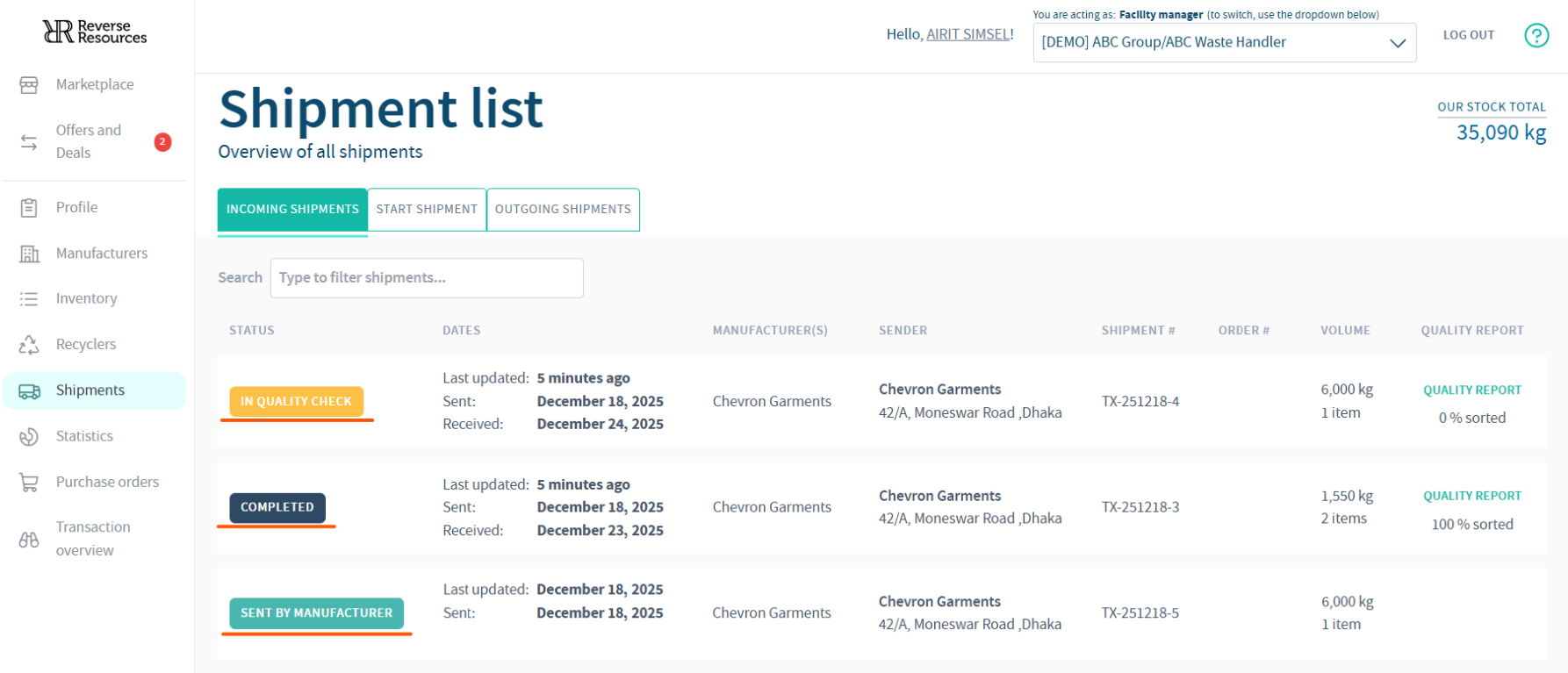 IN QUALITY CHECK – upon arrival, START QUALITY CHECK was chosen, but the check has not been completed yet. Some of the received waste might already be sorted and added to the inventory, while some may still need checking.