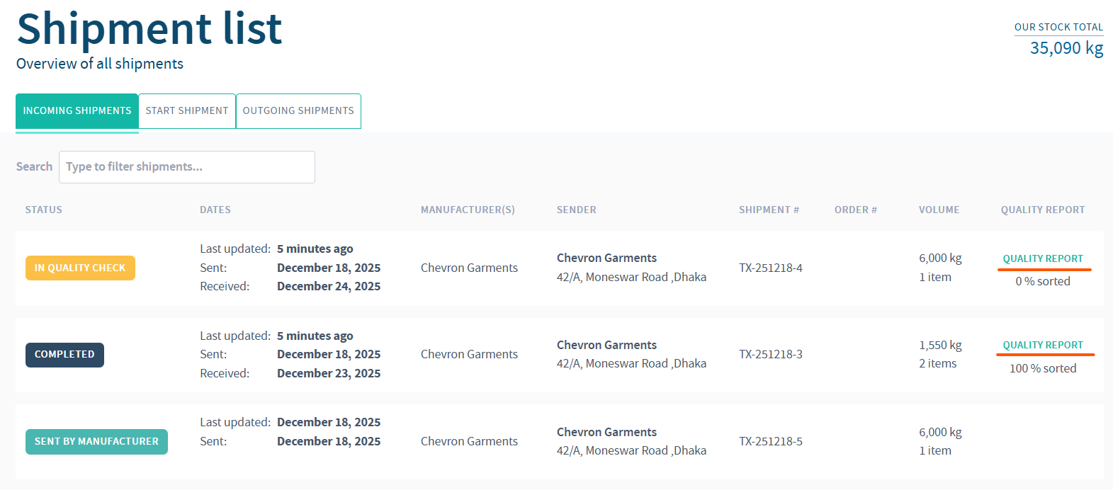 If START QUALITY CHECK is selected, a QUALITY REPORT button is created for the corresponding shipment on the INCOMING SHIPMENTS page.