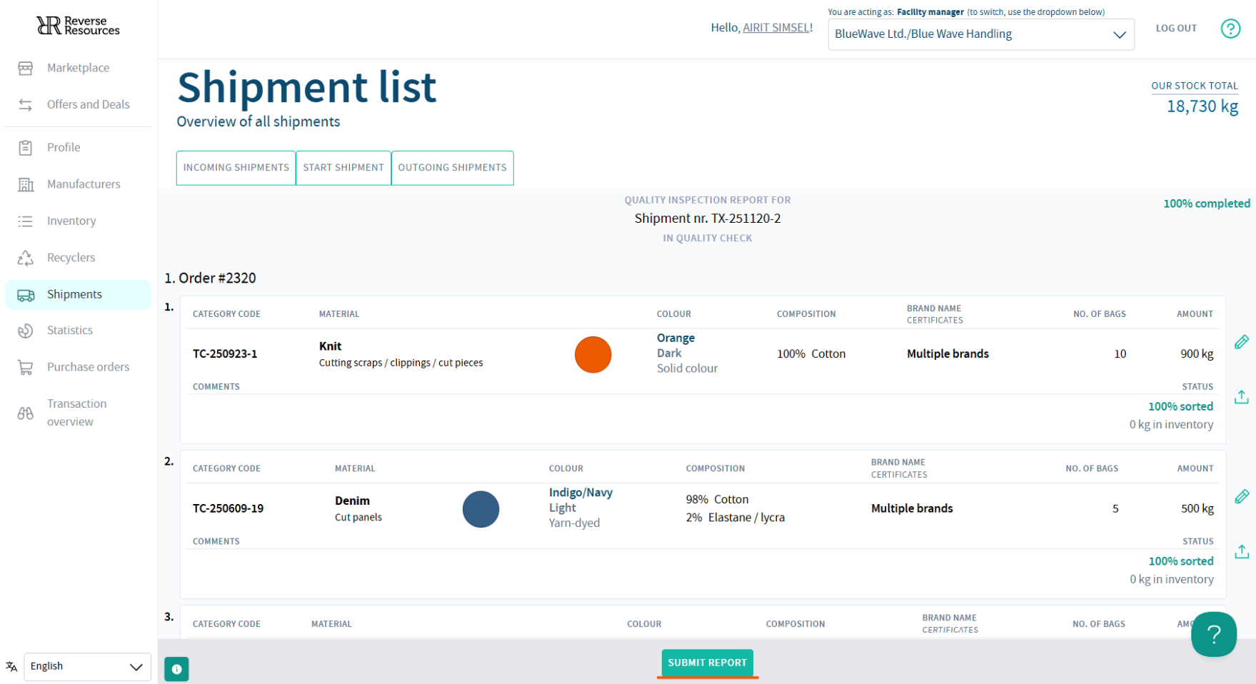 Submitting the report will change the shipment status to COMPLETED and automatically add all materials to your inventory.