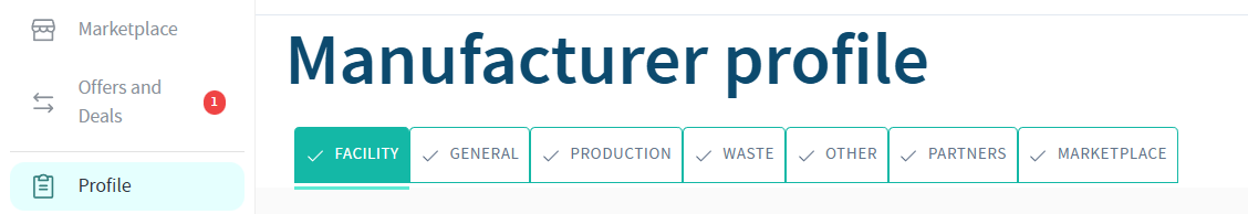 The profile comprises 6 tabs - FACILITY, GENERAL, PRODUCTION, WASTE, OTHER and PARTNERS.