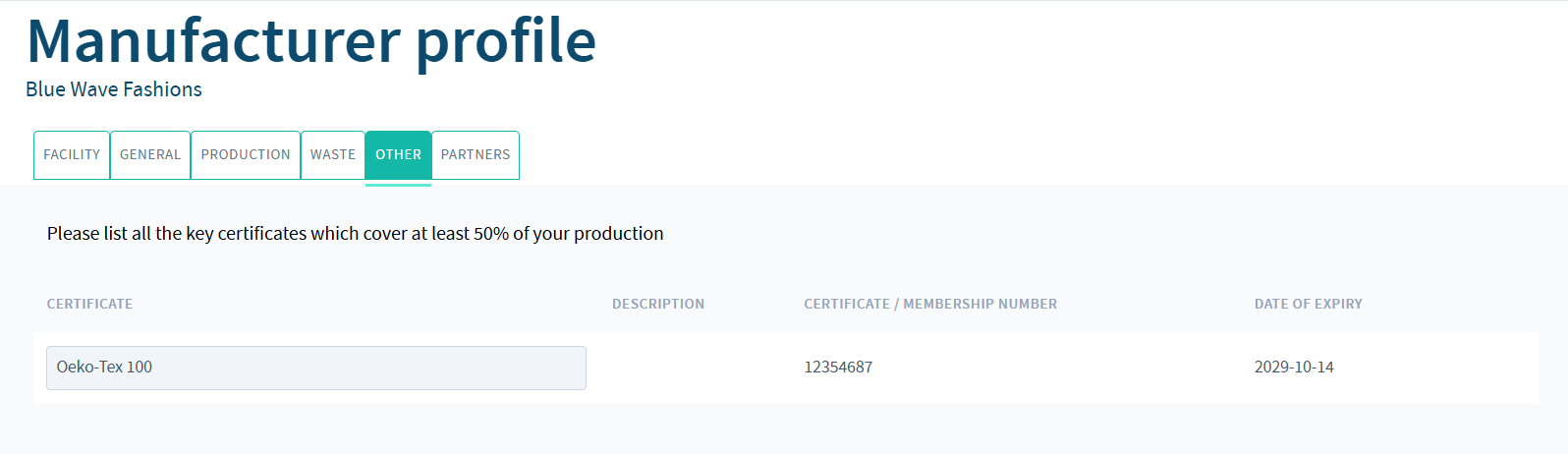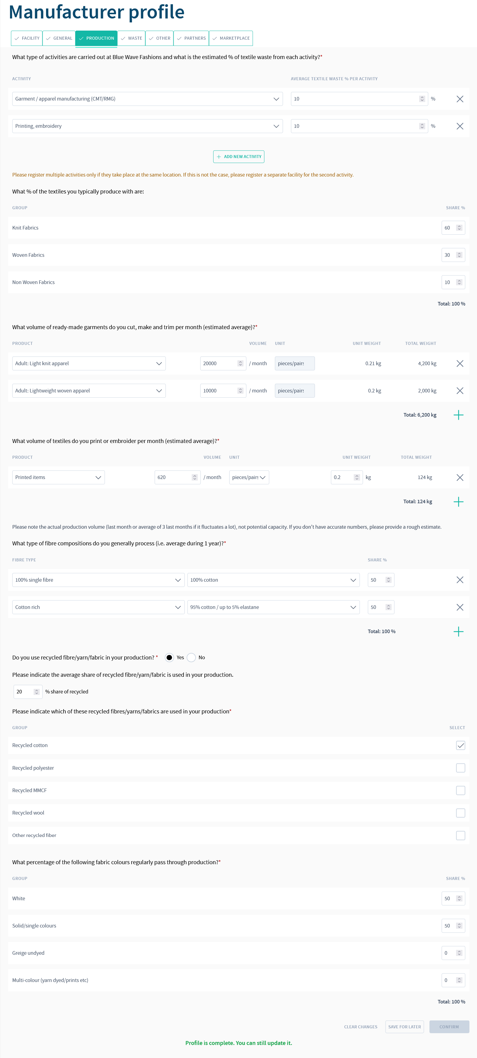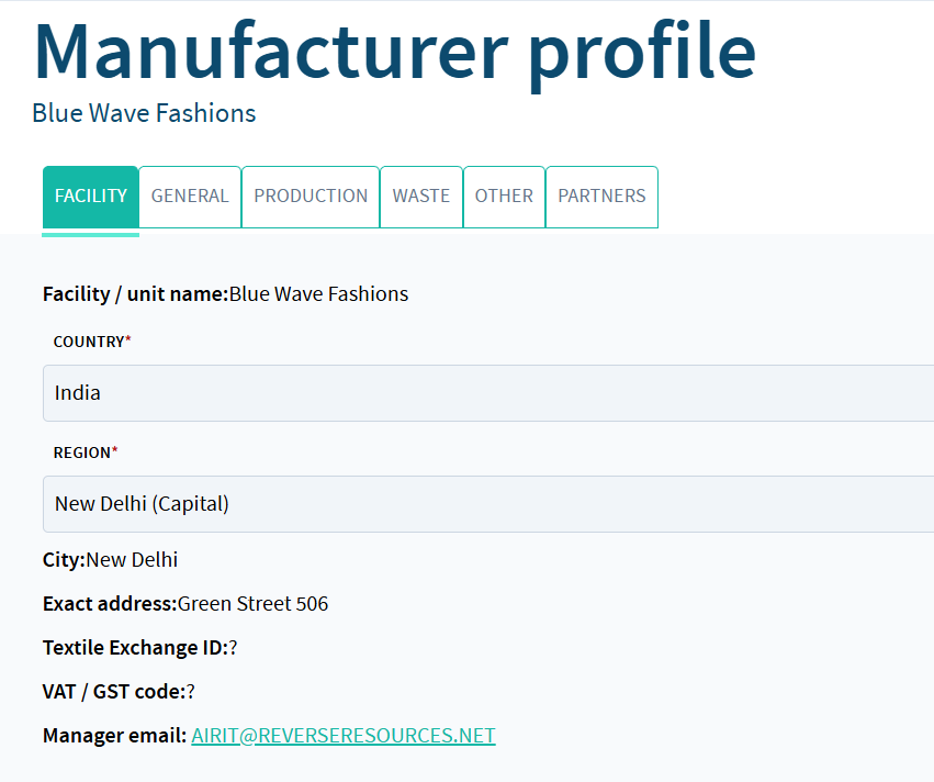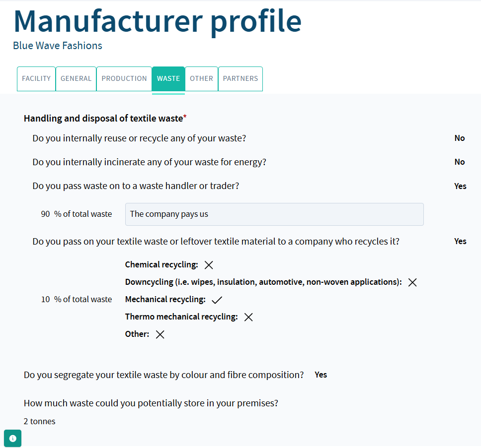 We understand that answering this may feel sensitive, especially if you are bound by confidentiality agreements or consider this business-critical information. To reassure you: the information you enter here is only visible to users within your own facility and to Reverse Resources administrators. It is not visible to other manufacturers, brands, handlers, or recyclers on the platform.